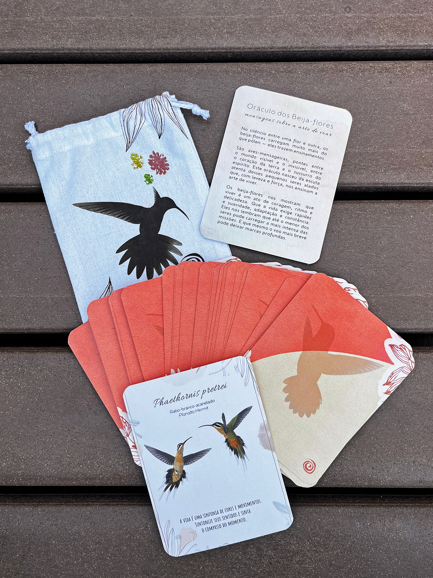 Um baralho com mensagens inspiradoras baseadas no comportamento, na ecologia e na beleza dos beija-flores. Cada carta representa uma das 41 espécies do Cerrado, com ilustrações científicas do artista Denis Balduino. Aprenda o que os beija-flores tem a nos ensinar!