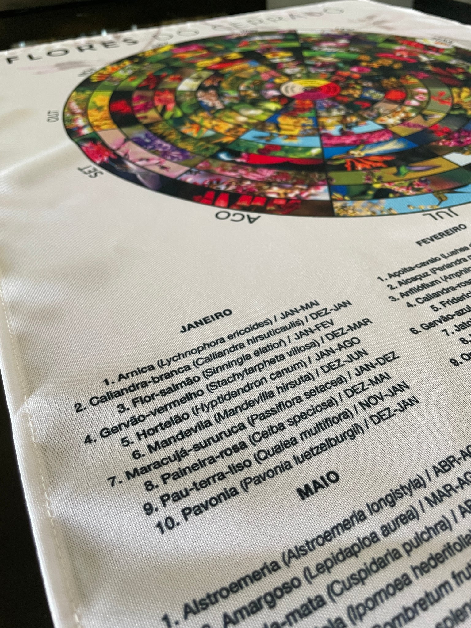 Impressos em tecido Oxford, no tamanho 75 cm de altura por 55 cm de largura, os calendários podem ser emoldurados, pendurados em paredes, murais ou painéis, funcionando tanto como peças decorativas quanto como guias práticos de consulta.