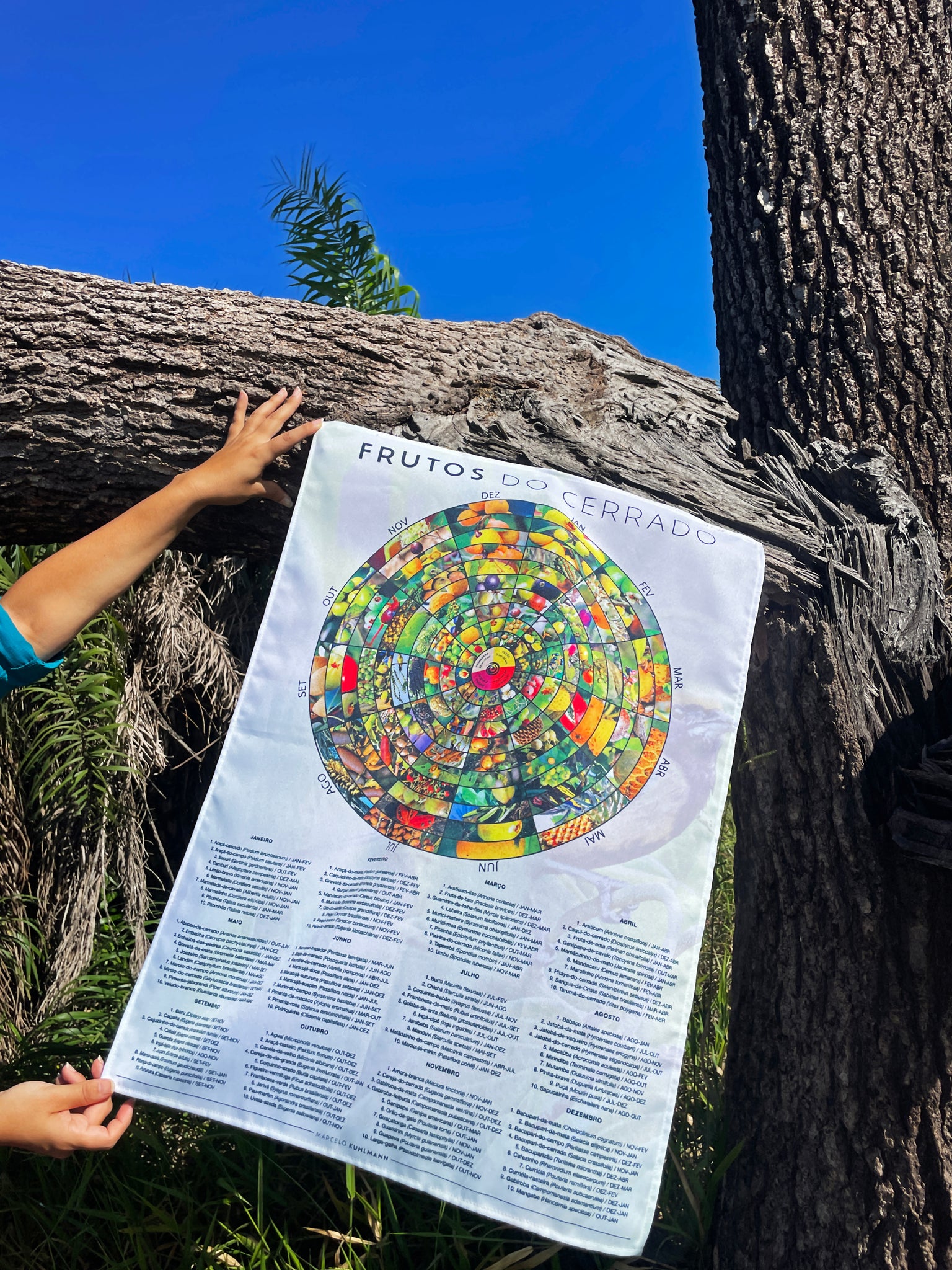 As fotografias foram organizadas em forma de mandala, criando um calendário circular dividido em 12 partes — uma para cada mês. O resultado é ao mesmo tempo informativo e poético: um retrato vivo do ritmo natural do Cerrado.