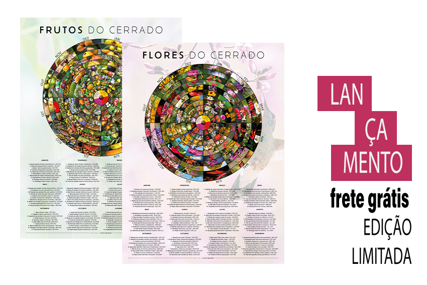 Cada calendário apresenta uma seleção de 120 espécies ornamentais e frutíferas, distribuídas ao longo do ano em 10 espécies por mês, indicando visualmente a época de floração ou frutificação de cada planta no bioma Cerrado.
